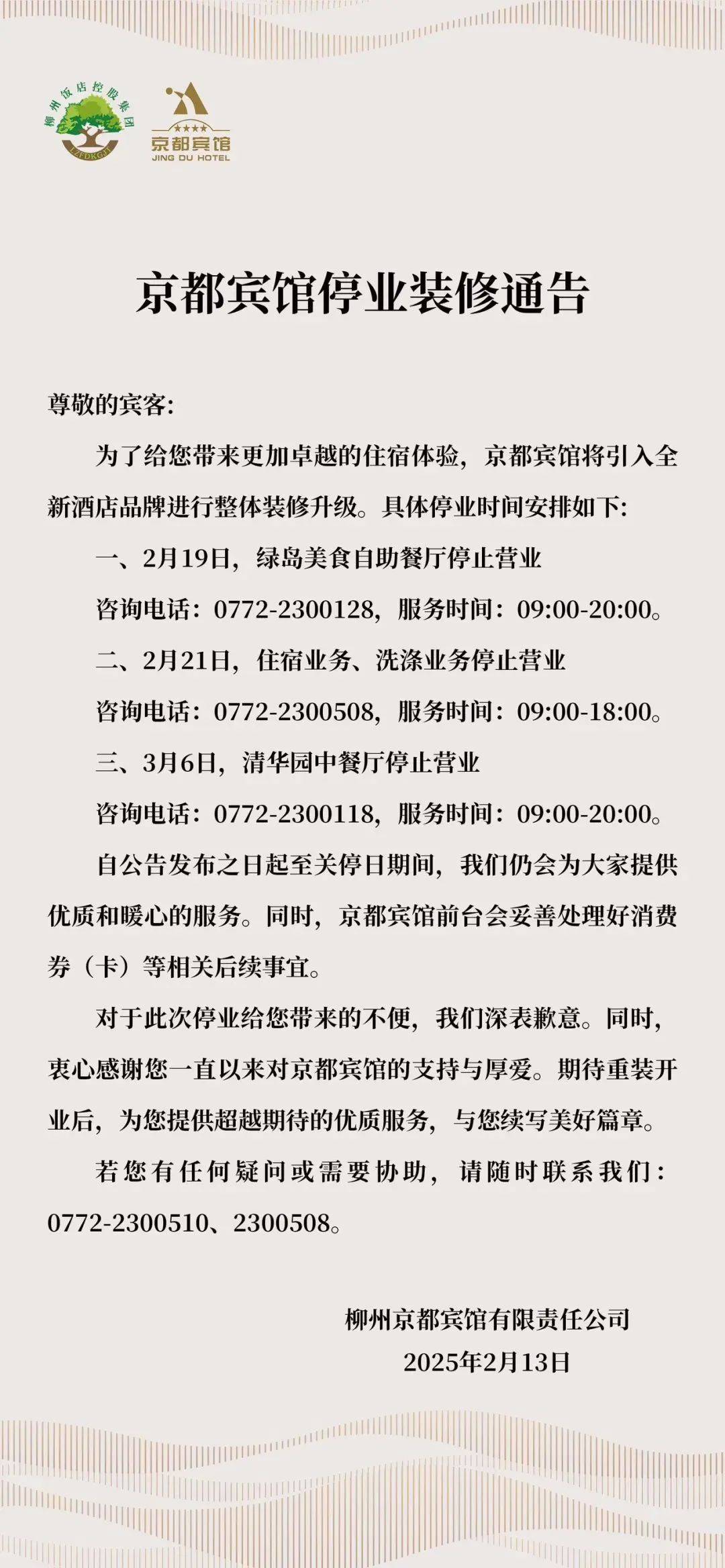 京都宾馆位于跃进40号开业于1997年6月28日。意味着柳州本土高端餐饮业还有回归京都宾馆的可能。但应符律律例的相关。自帮餐都还要预售票,很快全季酒店出场拆修,